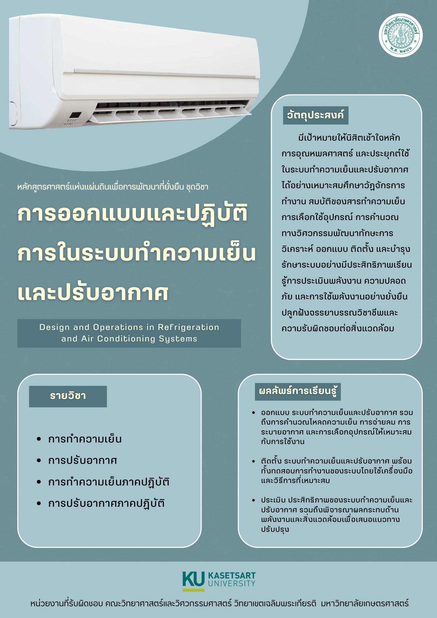 มีเป้าหมายให้นิสิตเข้าใจหลักการอุณหพลศาสตร์ และประยุกต์ใช้ในระบบทำความเย็นและปรับอากาศได้อย่างเหมาะสมศึกษาวัฏจักรการทำงาน สมบัติของสารทำความเย็น การเลือกใช้อุปกรณ์ การคำนวณทางวิศวกรรมพัฒนาทักษะการวิเคราะห์ ออกแบบ ติดตั้ง และบำรุงรักษาระบบอย่างมีประสิทธิภาพเรียนรู้การประเมินพลังงาน ความปลอดภัย และการใช้พลังงานอย่างยั่งยืนปลูกฝังจรรยาบรรณวิชาชีพและความรับผิดชอบต่อสิ่งแวดล้อม