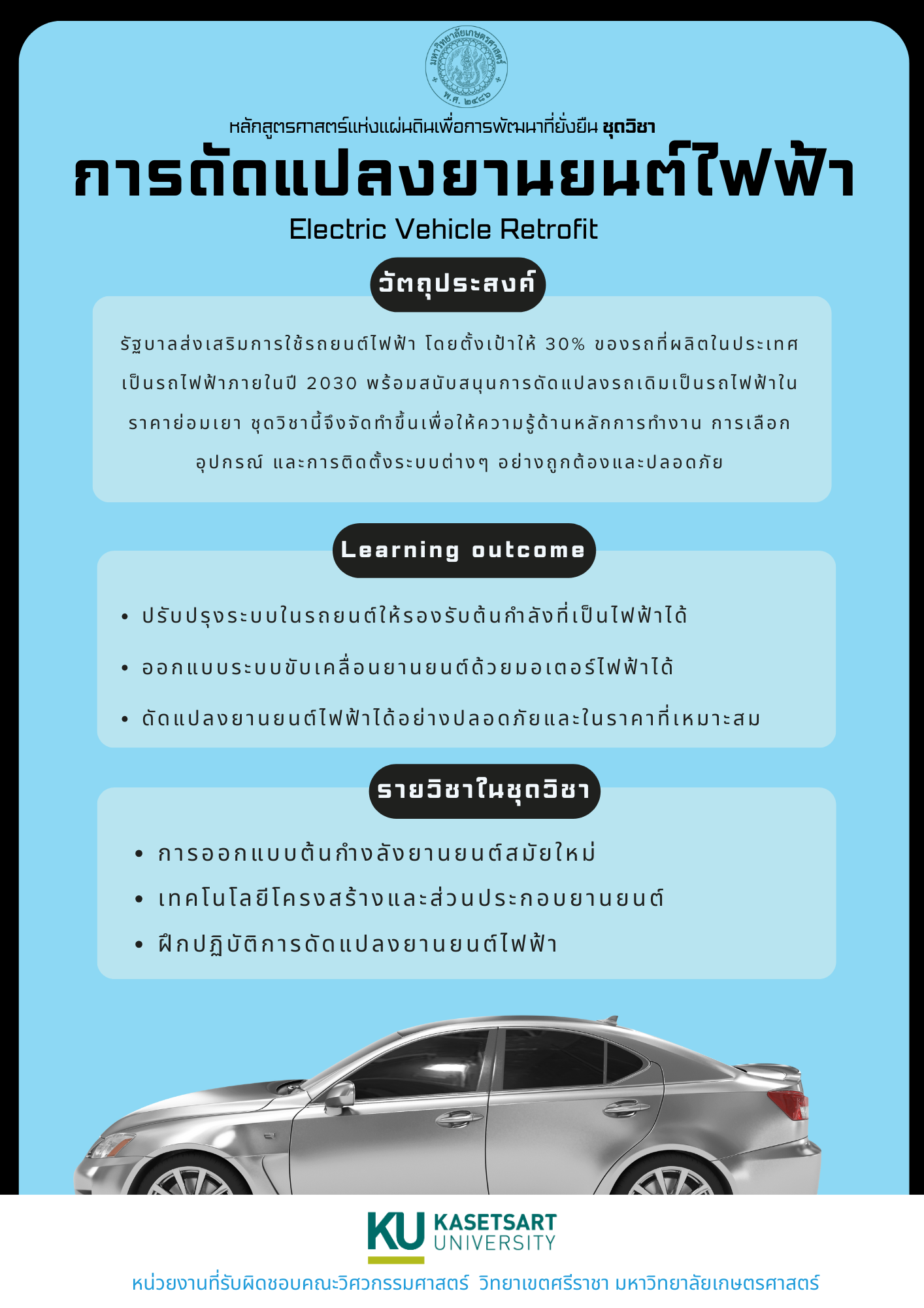 รัฐบาลมีนโยบายส่งเสริมให้ประเทศไทยใช้รถยนต์ไฟฟ้ามากขึ้น โดยตั้งเป้าให้ 30% ของรถที่ผลิตในประเทศเป็นรถยนต์ไฟฟ้าภายในปี 2030 เพื่อช่วยลดมลพิษและก้าวสู่สังคมคาร์บอนต่ำ หนึ่งในแนวทางคือการเปิดโอกาสให้ประชาชนสามารถ “ดัดแปลง” รถยนต์เครื่องยนต์เดิมให้กลายเป็นรถยนต์ไฟฟ้าได้ในราคาที่ไม่แพง แต่การดัดแปลงรถต้องมีความรู้ เพราะหากออกแบบผิดอาจไม่ปลอดภัย หรือทำให้ต้นทุนสูงขึ้นเกินจำเป็น ดังนั้นชุดวิชานี้จึงถูกออกแบบมาเพื่อให้ความรู้เกี่ยวกับรถยนต์ไฟฟ้า ตั้งแต่หลักการทำงาน ส่วนประกอบ การคำนวณต้นกำลัง การเลือกใช้ระบบส่งกำลัง ไปจนถึงการติดตั้งระบบไฟฟ้าและแบตเตอรี่ให้ถูกต้องและปลอดภัย