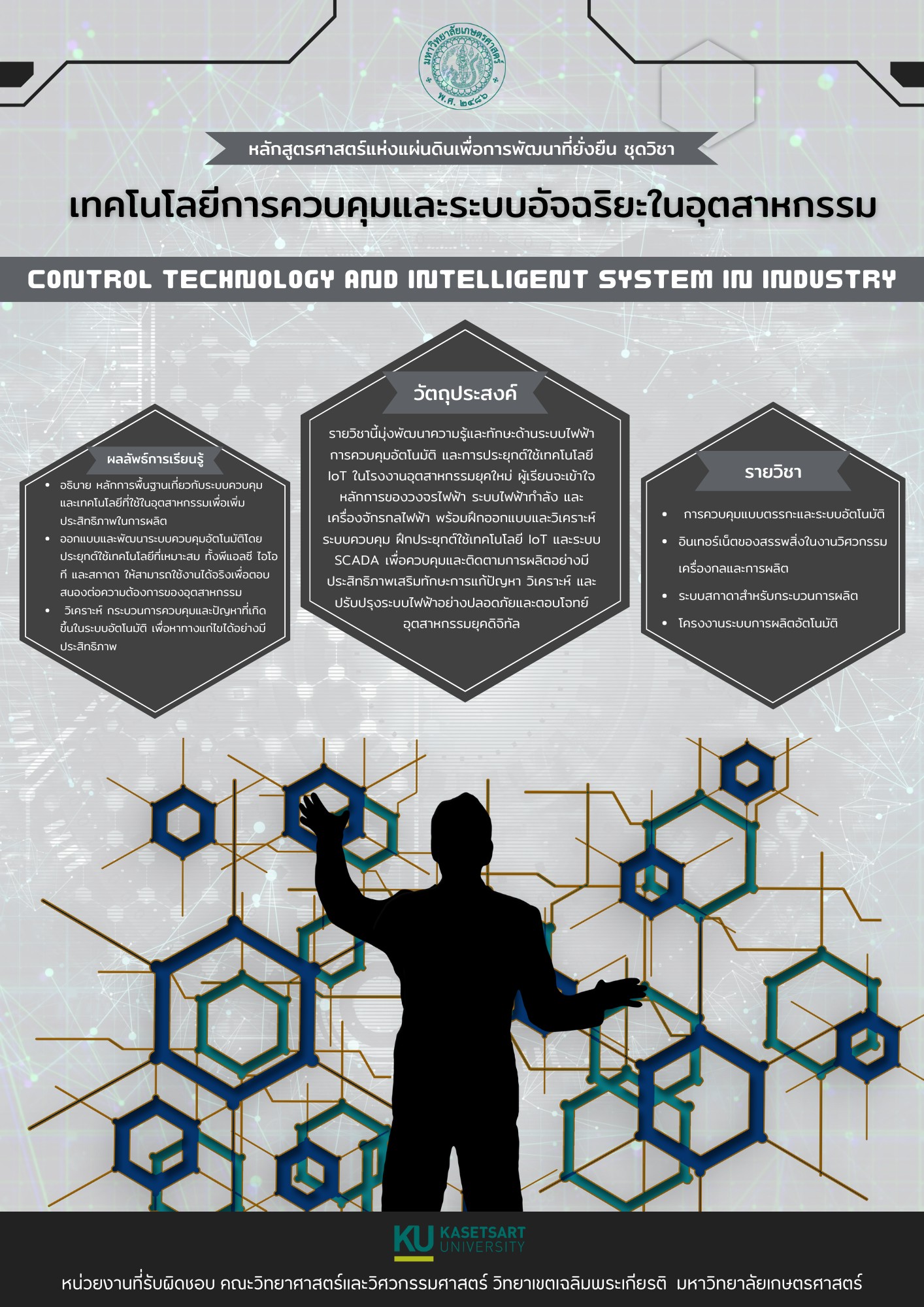 รายวิชานี้มุ่งพัฒนาความรู้และทักษะด้านระบบไฟฟ้า การควบคุมอัตโนมัติ และการประยุกต์ใช้เทคโนโลยี IoT ในโรงงานอุตสาหกรรมยุคใหม่ ผู้เรียนจะเข้าใจหลักการของวงจรไฟฟ้า ระบบไฟฟ้ากำลัง และเครื่องจักรกลไฟฟ้า พร้อมฝึกออกแบบและวิเคราะห์ระบบควบคุม ฝึกประยุกต์ใช้เทคโนโลยี IoT และระบบ SCADA เพื่อควบคุมและติดตามการผลิตอย่างมีประสิทธิภาพเสริมทักษะการแก้ปัญหา วิเคราะห์ และปรับปรุงระบบไฟฟ้าอย่างปลอดภัยและตอบโจทย์อุตสาหกรรมยุคดิจิทัล