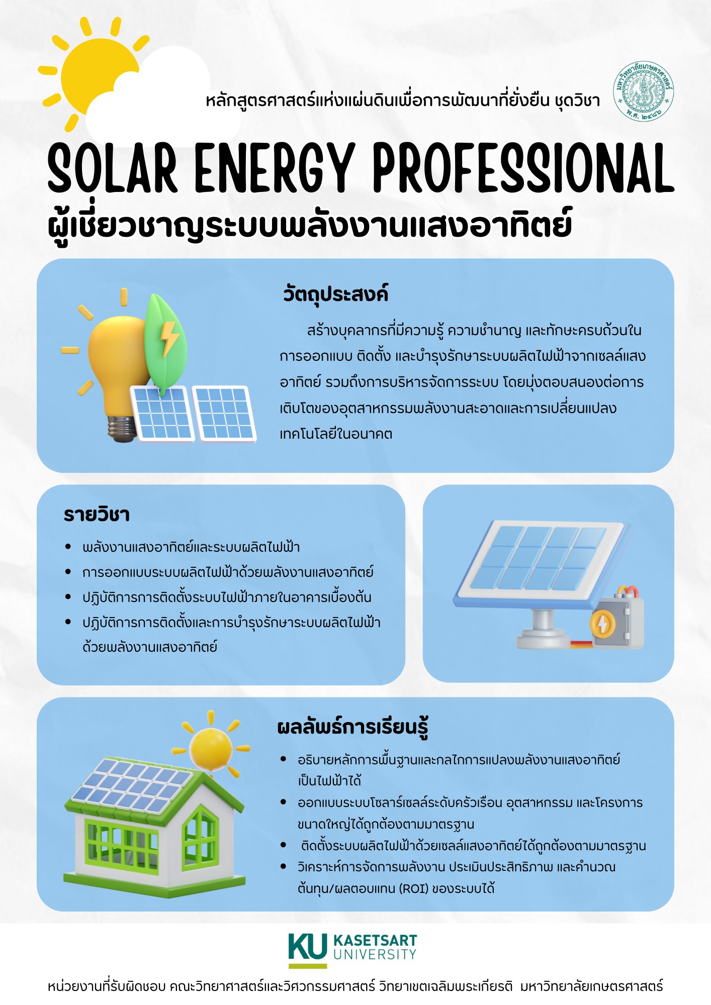 สร้างบุคลากรที่มีความรู้ ความชำนาญ และทักษะครบถ้วนในการออกแบบ ติดตั้ง และบำรุงรักษาระบบผลิตไฟฟ้าจากเซลล์แสงอาทิตย์ รวมถึงการบริหารจัดการระบบ โดยมุ่งตอบสนองต่อการเติบโตของอุตสาหกรรมพลังงานสะอาดและการเปลี่ยนแปลงเทคโนโลยีในอนาคต